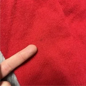 Preowned item with HEAVY pilling and fuzziness to fabric. A few dark stains as shown, on sleeves. Some snags to sweater and embroidery. Material crackles a little when stretched. Hole in collar cuff.