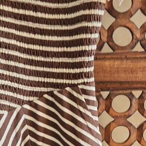 Features: Comfy cotton fabrication, paneled skirt, smocked bodice, V-neckline and back, bow details at shoulders