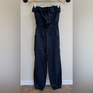 Deep navy 100% linen strapless jumpsuit with elasticized waist and ankle. Simple, versatile wardrobe staple. So comfortable and perfect for spring and summer!