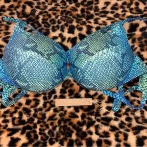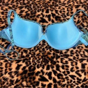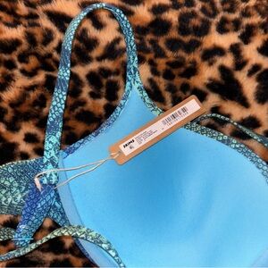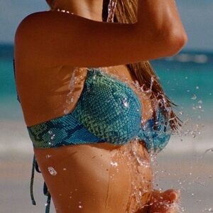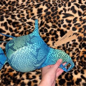 Underwire bikini top with a teal green snakeskin print. Ties at the back for an adjustable fit.