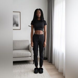 Cozy black slip-on slippers with soft faux fur trim for everyday comfort. Easy to wear design provides relaxed support and plush warmth. Sleek style works well for lounging at home or quick outings.