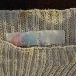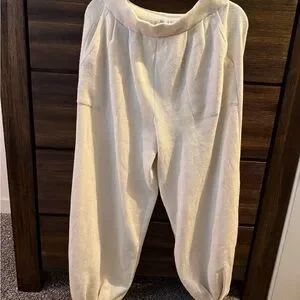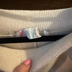Knit beach set. Boxy knit top with short dolman sleeves. Features a small front patch pocket. Crew neckline and relaxed fit. Soft beige neutral color. Pants parachute style with elastic at the ankle.
