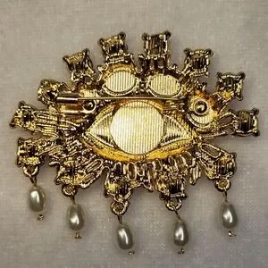 Design: The brooch features a central eye motif with a textured gold sunburst-style setting, surrounded by clear rhinestones and oval cabochons. Faux pearls dangle from the bottom edge.