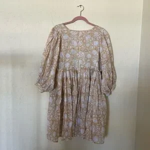 Bought in New Zealand but was too big. One hundred percent cotton. Elegant dress with intricate floral design. Mustard and cream hues. Ideal for relaxed gatherings.