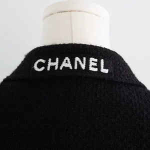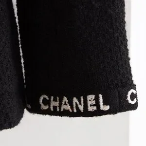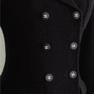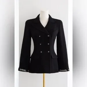 Cut with a fitted waist and structured shoulders, the jacket creates a clean, defined silhouette. It features a double breasted front with matte black CC logo buttons, flap pockets at the hips, and white CHANEL embroidery along the sleeve cuffs and across the back collar. The contrast lettering gives it a subtle but unmistakable identity without overpowering the classic tailoring.