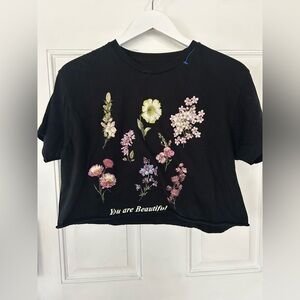 Black short-sleeve cropped tee featuring a colorful floral print and uplifting "You are Beautiful" text. Soft casual knit for everyday wear. Easy to style with high-waist jeans or skirts. Floral accents in pink, yellow, blue and cream add feminine detail to the black base.
