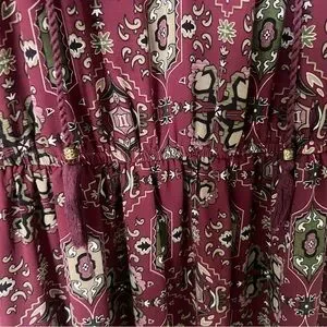 Flowing maxi dress with long sleeves. All-over geometric pattern in contrasting tones. Cinched waist for shape. Lightweight, drapey fabric for easy wear.