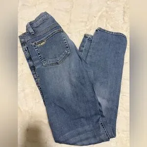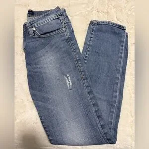 Slim fit women's skinny jeans with intentional distressing. Stretch denim for comfortable movement.