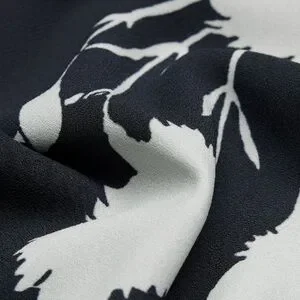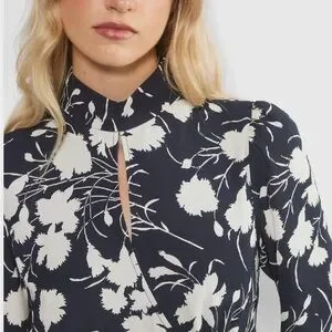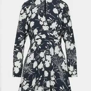 Wilfred a-line, mockneck, long sleeve mini dress with a bold floral pattern. Wrap front with a keyhole cutout. Light drapey crepe fabric with an invisible zipper at the back.