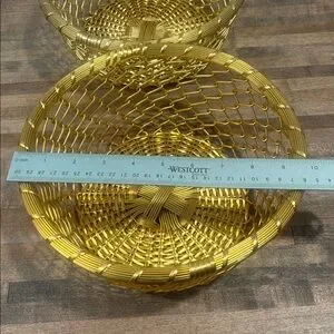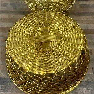 Stylish gold woven metal bowls for decorative display. Lightweight design adds shimmer to any room. Perfect as a centerpiece or for organizing small items. Gold finish brings warm, elegant accent to your decor.