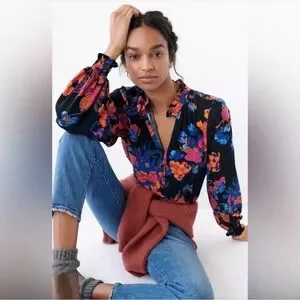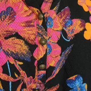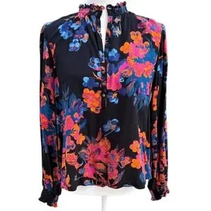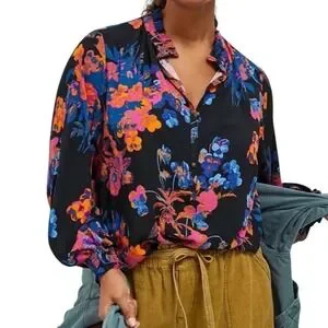 This lightweight viscose blouse showcases a vibrant tropical floral print in shades of pink, orange, and blue against a black ground. Designed with a ruffled neck and a partial button-front placket featuring intricate metallic buttons, this top offers a refined bohemian aesthetic.