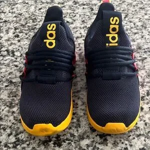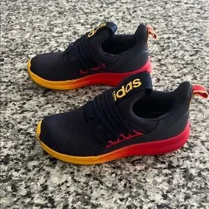 Kids athletic sneakers by adidas. Navy Blue mesh upper with red-to-yellow gradient midsole. Elastic laces and pull tab for easy on. Cushioned sole for daily play.