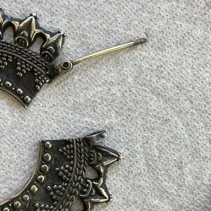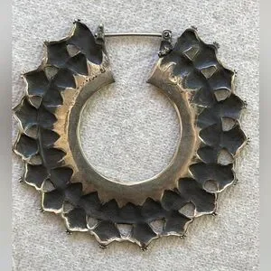 Very Rare pair of black patina Afghani hoop earrings. They are not light, but not super heavy, right in the middle weight wise. Bought these a while ago and never wore them, figured I should find someone who would enjoy them. The pole that goes into the ear is definitely a little bigger than the normal earring hole, so unless you have a bit of a stretch hole, these may not fit. Awesome piece of jewelry, they look amazing on. $300