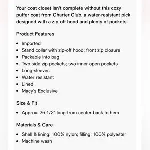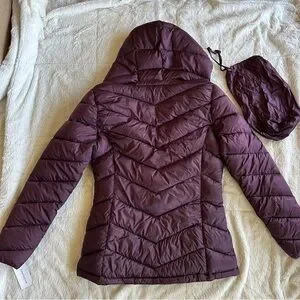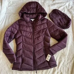 NWT Charter Club Packable Puffer Jacket in Deep Plum (sold out color). Brand new with tags, never worn. Features fitted silhouette, slim diagonal lines, warm insulation, zip off hood, zippered pockets, cinch bag. Size: Women’s Small