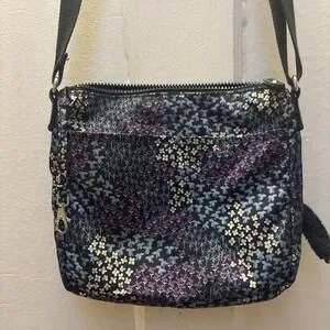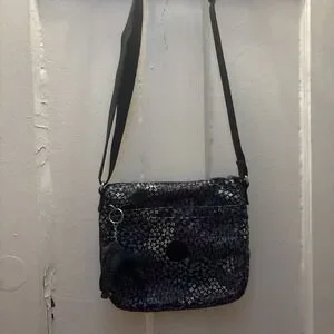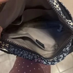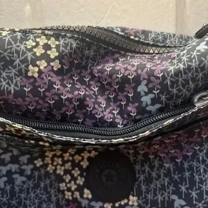 Excellent condition, Kipling bag navy blue background with floral. front zipper pocket. Main pocket has a zipper and then another zipper pocket inside and then another storage compartment in the back adjustable shoulder strap.