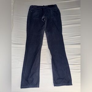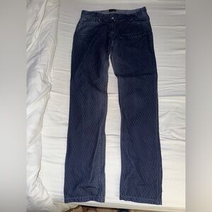 Straight-cut, regular-fit, five-pocket pants. Embellished with customized rivets and buttons. Concealed zipper closure. All over logo print. Excellent condition