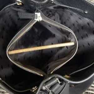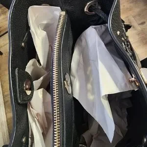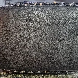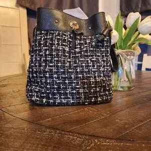 Unique woven tweed design with black pebbled leather accents. Perfect for versatile wear. Adjustable crossbody strap. Front slip pocket. Beautiful turn lock closure. Inside features 3 separate compartments with a zippered middle compartment. Beautiful black,white with hints of blue tweed.