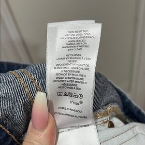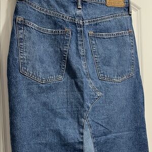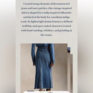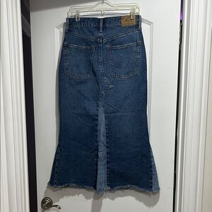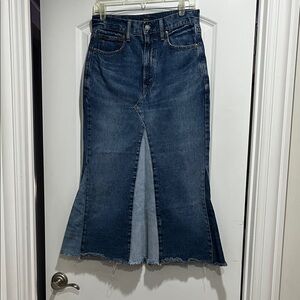 Dark blue denim skirt with a two-tone front panel. Fitted through the hips and flares to a mermaid hem. Raw-edge hem for a casual look. Classic five-pocket styling. In excellent condition.