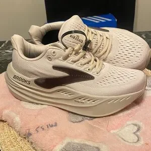 Comfortable Brooks sneakers in cream with brown detailing. Ideal for running and sports.