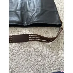 Stylish and versatile Carbon2Cobalt “All-In” shoulder bag crafted from smooth black leather with contrasting brown braided leather shoulder straps and brass-tone hardware. This bag features a clean, minimalist design with durable stitching and a spacious interior, making it perfect for everyday use, work, or travel. The comfortable braided strap adds a unique detail while allowing the bag to sit easily on the shoulder.