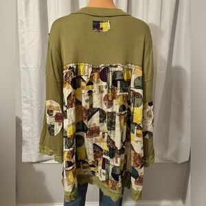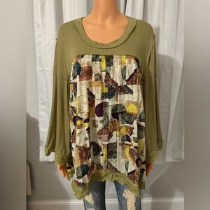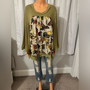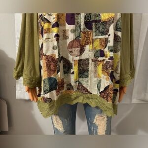 This is a cool olive green print long sleeve babydoll shirt with crochet trim