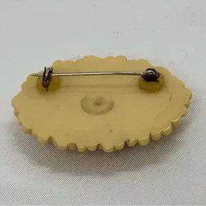 Vintage Celluloid Molded Floral Brooch Celluloid, molded. Measures 2” W x 1.5” L. Safety clasp. Very good condition.