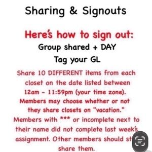 Share 10 different, available items from all closets listed in your assignment btwn 12am - 11:59pm (your time). Members choose whether or not they share “VACATION” closets. Members who do not share, sign out, or have non compliant items will be removed from the group. GLs are VOLUNTEERS who help keep our group strong. Time spent following up, checking shares, reporting out, is time they could be spending on their own closets. Please respect their time & don’t make them chase you for sign outs.