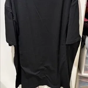 Black t-shirt featuring a bold graphic with yellow and blue design