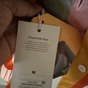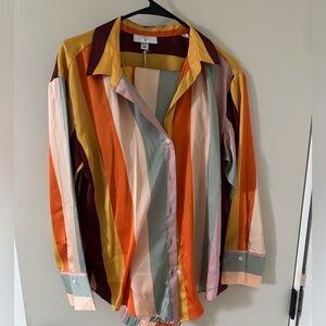 Vibrant striped button-up shirt and pants.. Features a mix of orange, yellow, green, and pink stripes.