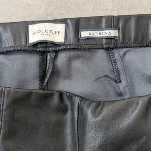 Chic Seductive “Sabrina” faux leather pants in classic black. These elegant 7/8 length trousers feature a sleek coated finish that mimics leather while remaining comfortable and flexible.