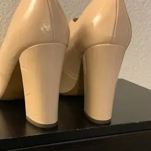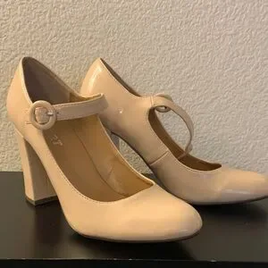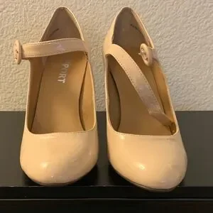 Chic Mary Jane heels with a glossy finish. Features a stylish buckle strap. Color is more cream with a slight blush finish. Minor wear on heel, noted in photos. Reflected in price.