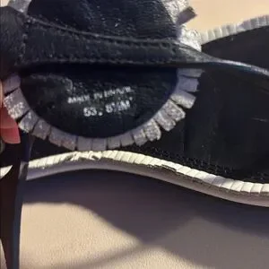 Stylish Tory Burch thong sandals in black leather. Signature round medallion detail at toe. Adjustable ankle strap for a secure fit. Contrasting white trim around the sole adds visual interest. See pictures gb1