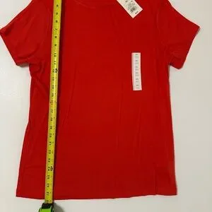 Soft short sleeve tee in a vibrant red. Crewneck style with a straight hem. Lightweight knit fabric for everyday wear. Simple, clean design with small side vents. Brand new with tags attached.
