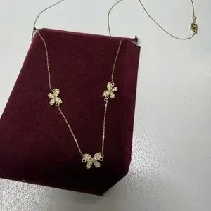Delicate 14k gold butterfly necklace with sparkling diamond accents. Lightweight chain and three butterfly charms create a feminine look. The gold tone adds warm shine to any outfit.