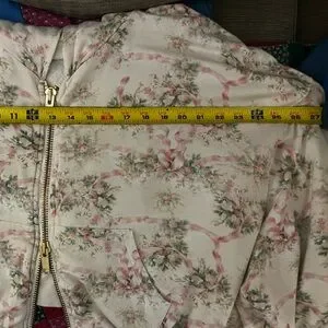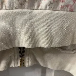 Lightweight floral zip-front jacket in cream with pink floral-print accents and 2 gold zippers.