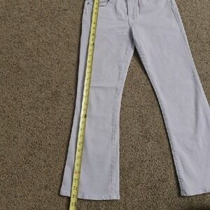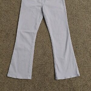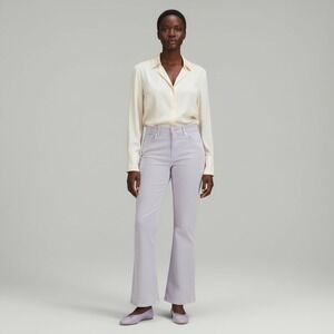 Classic boot cut silhouette. High-rise waist and fitted through the hip. Subtle lilac color for soft style. Versatile and easy to pair.