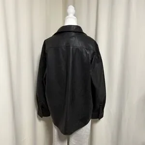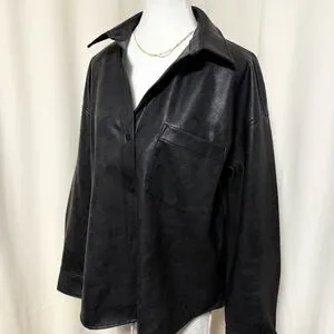 Stylish black vegan leather button-up shirt with a classic collar and front pocket. Perfect for a chic and edgy look.