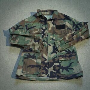 This Vintage 90s U.S. Army Woodland Camo Cold Weather Field Jacket Coat in size Medium Long is a Military-style jacket perfect for outdoor enthusiasts and military personnel. Made with a durable cotton blend outer shell and lined with comfortable cotton, this mid-length jacket features a camouflage pattern, button closure, and practical pockets for various items. The spread collar and regular fit add to its classic and timeless appeal, making it a versatile piece for travel, casual outings, or workwear. Built in the United States by the U.S. Military, this vintage jacket also includes features such as full zip and lining for added warmth, making it a versatile and stylish addition to any wardrobe.