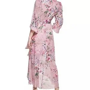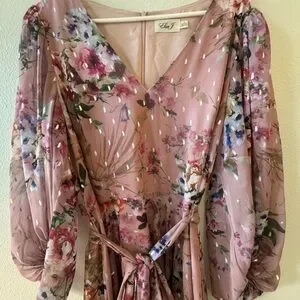 Eliza J floral pink tie waist dress. Beautiful airy fabric with pink florals and metallic foil accents. High / low hem with ruffle. Perfect for casual summer wear, wedding guest, outdoor parties.