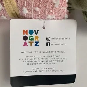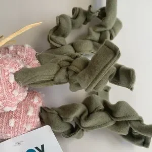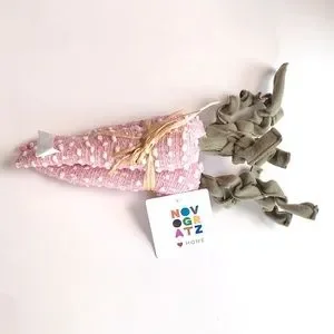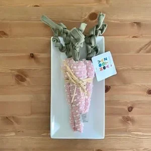 Tied with raffia, this bundle of 3 pink cloth carrots feature white pom pom accents with bendy “greens” (can twist or untwist).