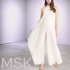Subtle shimmer and a flowing silhouette bring elegant drama to this mock-neck jumpsuit from MSK.