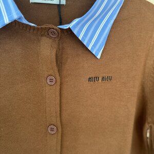 NWT Women's Brown Wool Miu Miu Cardigan with Blue Striped Collar Sz L