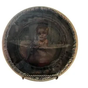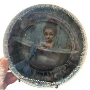 Round decorative plate featuring a painted mermaid girl in a bathtub. Muted tones with antique-style border. Display-ready accent piece.
