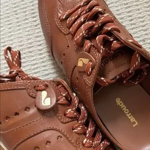 The most amazing easy-to-slip on sneaker mule by Larroude. This is THE silhouette of the spring and are perfect for any occasion. Made from beautiful caramel brushed calf leather, a little logo tag on each one, sporty laces, and an insole with memory foam cushion. These are new without tags, have never been worn. Just tried on once. A little too big for me as they are a true size 7.