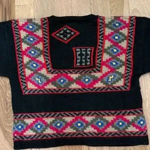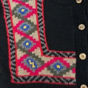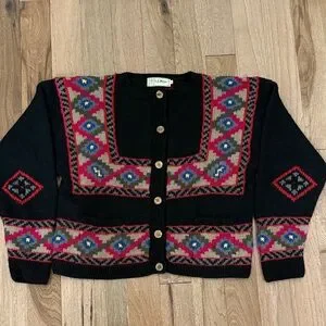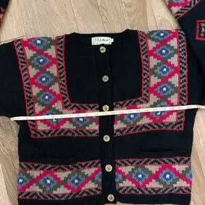 Beautiful vintage pure wool L.L. Bean cardigan! Size L. Good preowned condition. Beautiful vibrant colors on a black background. Please see measurements in photos. Gently worn. Minor fuzzies. Clean and fresh. Nonsmoking home.