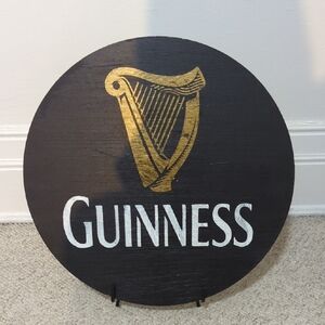 Circular sign with gold harp and white Guinness text on black. Ideal for bars or home decor.