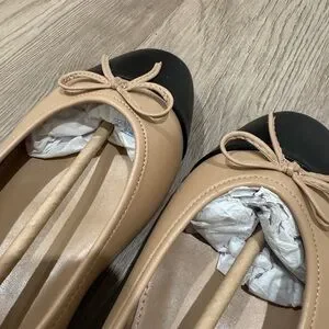 Chic two-tone ballet flats with black cap toes and beige bodies. Soft leather upper with a small bow accent. Low-profile sole for easy wear. Polished look for work or weekend outfits.