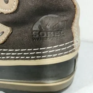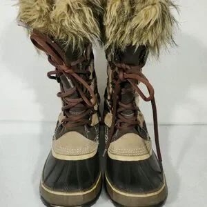 The Sorel Women's Joan of Arctic Brown Waterproof Winter Boots in size 5 are a stylish and practical choice for cold weather. These mid-calf boots feature faux fur lining for warmth, a low heel for comfort, and a waterproof suede upper material. Perfect for outdoor activities in winter, these snow boots are designed to keep your feet dry and cozy in snow and ice. The classic brown color and flat heel style make them versatile for various winter outfits, while the Sorel brand ensures quality and durability.