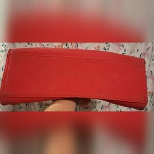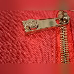 In overall beautiful condition. There is some very faint discoloration near the bottom. Otherwise, the fabric is crisp and made from high quality. Outer and inner zipper pockets. Inner slip pockets. Adjustable straps. Gold tone hardware. 14×11×5.