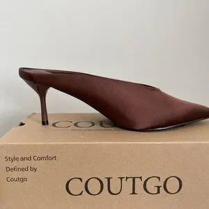 Coutgo, new-in-box kitten-heel mules in brown satin. Size 7.5 with a 2.5" heel.